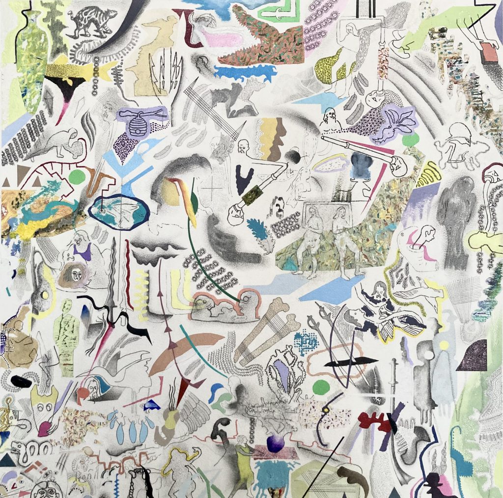 For Kudra 23. Acrylic, Pencil, Oil Pastel, Ink on Paper. 22” x 22” 2026.