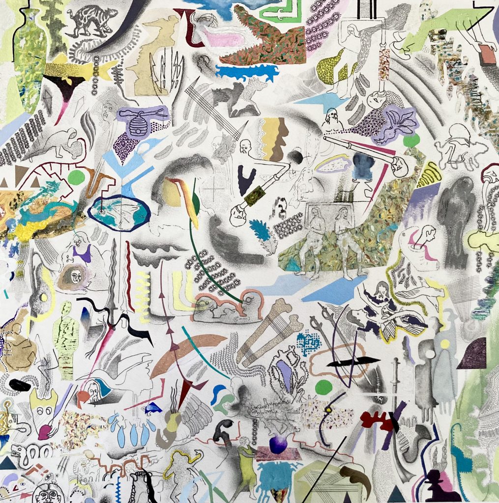 New Landscapes Are Eagerly Explored. Acrylic, Oil Pastel, Ink, Pencil on Canvas. 24” x 24” 2023. SOLD